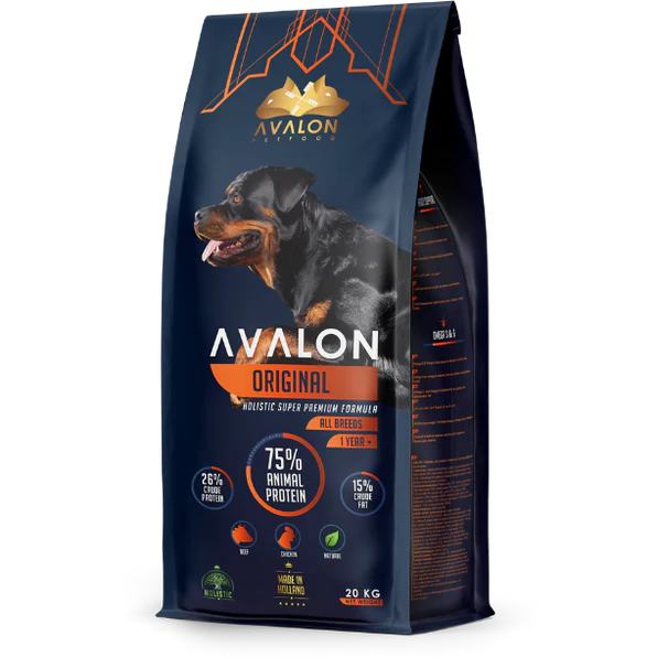 Az Avalon Original ideális eledel egy évnél idősebb kutyák számára. Az Avalon állatbarátok, állatorvosok, tenyésztők és táplálkozási szakértők által összeállított termékei garantálják kutyája ideális táplálását. Az Avalon Original 100%-ban természetes, rostokban, omega-zsírsavakban és állati fehérjékben gazdag. Ráadásul az Avalon Originalban feldolgozott friss húsnak köszönhetően négylábú barátod ellenállhatatlan ízélményt kap!