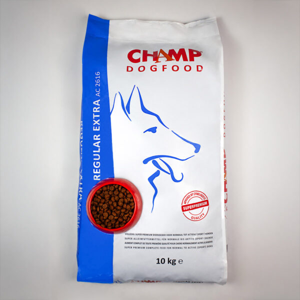 Az extrudált prémium minőségű termék magas fehérje tartalmával a különösen aktív kutyák részére készült. Baromfitermékekre felépített több mint teljes értékű kutyatáp munkakutyák vagy olyan kutyák részére, amelyek nagyobb terhelésnek vannak kitéve. A Regular Extra növekedésben lévő kutyák vagy olyan kutyák részére is alkalmazható, amelyek túl kevés (természetükből eredően) táplálékot vesznek magukhoz. A rostban gazdag szentjánoskenyér gondoskodik az állandó szilárd székletről. Ezenkívül szép és fényes szőrzetet biztosít. Mivel a kutyatáp valamennyi anyagot a megfelelő arányban tartalmazza, ezért a Regular Extra az aktívabb (sport)kutyák részére készült speciális táplálék. A megfelelő vitaminokkal rendelkező összetétel a stresszre hajlamos kutyákra pozitív hatással bír. A kutyatáp az omega-6 és az omega-3 zsírsavakat optimális 5:1 arányban tartalmazza.